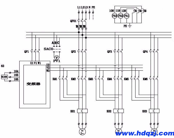 那么變頻器如何實現(xiàn)一拖多的功能?下面僅僅對一次電氣原理圖做出示例。二次電氣原理圖需要根據(jù)控制要求設(shè)計,此處暫不贅述。